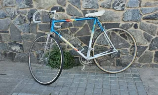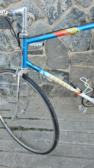 Bicicleta clásica de carretera Torrot con un diseño llamativo. - Cuadro de color azul y blanco. - Manillar con cinta blanca. - Sillín blanco. - Portabidón. Lleva tiempo sin usarse y el cambio trasero no va bien, se tiene que ajustar. El resto perfecto como se ve en las fotos.