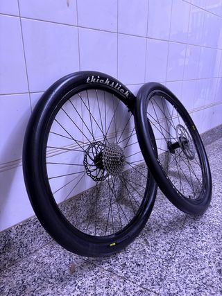 Juego de ruedas de bicicleta 26” en muy buen estado, casi sin uso. Incluyen neumáticos 26x2 thickslick en perfecto estado. Rueda trasera con cassette y ambas con freno de disco. Giran rectas, sin holguras ni radios rotos. Listas para montar y rodar.