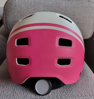 Casco de protección con un diseño moderno y llamativo. - Color blanco con detalles en rosa y líneas blancas. - Marca Btwin.