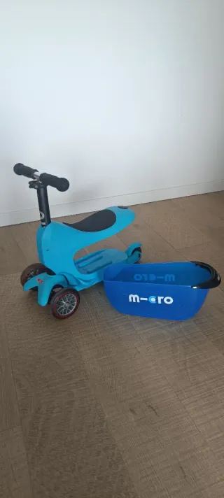 Patinete evolutivo Micro en color azul, ideal para acompañar el crecimiento de los más pequeños. - Diseño 3 en 1. - Incluye cesta. - Ruedas delanteras dobles.