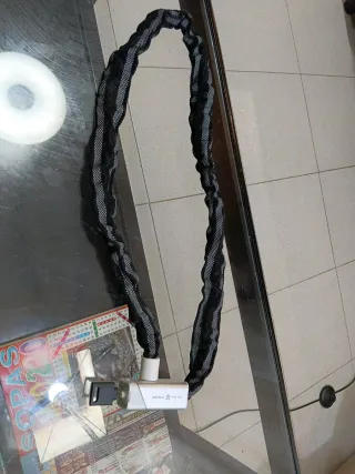 Candado de cadena con funda protectora, solo tiene una llave. - Color: Negro y gris. - Material: Metal y tejido. - Diseño: Cadena flexible.