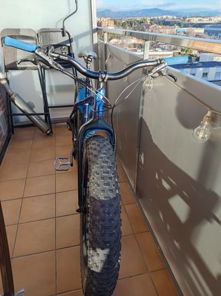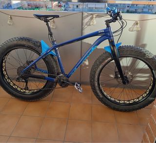 Fat bike Specialized de color azul. Ideal para todo tipo de terrenos. - Ruedas anchas para máxima tracción. - Cuadro robusto y resistente. - Guardabarros delantero y trasero. - Pastillas de freno y ruedas a estrenar