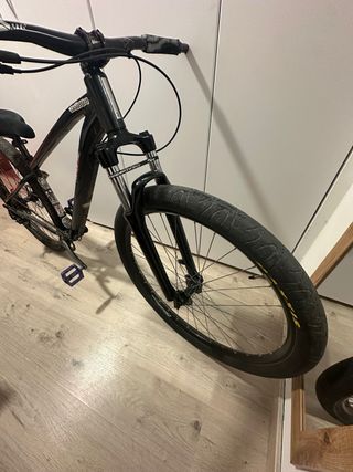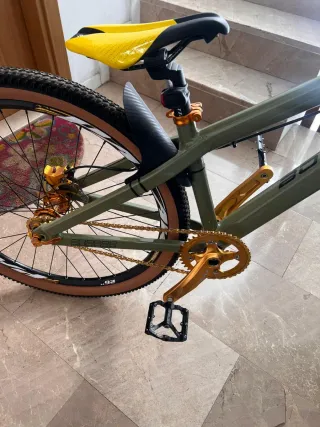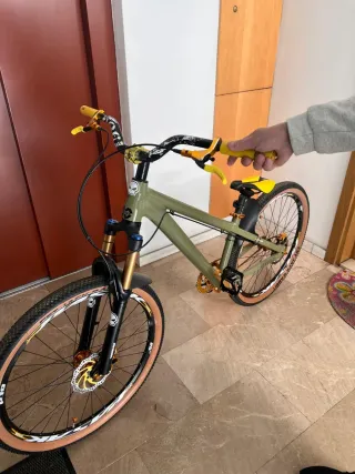 Bicicleta estilo Dirt Jump, ideal para saltos y trucos, la he utilizado una vez para probarla y ajustarla. - Cuadro de color verde militar. - Horquilla delantera dorada. - Llantas de 26 pulgadas con detalles en blanco. - Puños y sillín de color amarillo. - Frenos de disco.Hidraulicos - Guardabarros. Todo aluminio ligero. Pesa 6kg Para más información no dudes en enviarme un mensaje. 📩