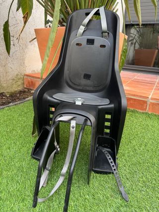 Sillita de seguridad para transportar bebés en bicicleta. Fabricada en plástico resistente y con arneses de sujeción. - Diseño ergonómico. - Cinturón de seguridad ajustable. - Reposapiés integrados.