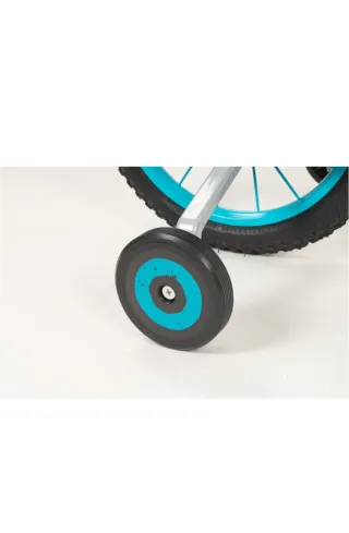 Bicicleta infantil con diseño divertido y llamativo. - Cuadro de color blanco con detalles verdes. - Ruedines incluidos para facilitar el aprendizaje. - Puños de manillar en color verde brillante. - Neumáticos negros con llantas decoradas en verde.