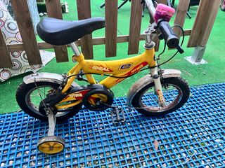Bicicleta infantil de color amarillo, ideal para los más pequeños que están aprendiendo a pedalear. Incluye ruedines para mayor estabilidad y un timbre para avisar. - Ruedines incluidos. - Timbre en el manillar.