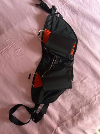 Porta bidón con diseño moderno en colores negro y naranja. - Compartimentos amplios. - Cintas ajustables. - Anilla metálica.