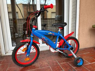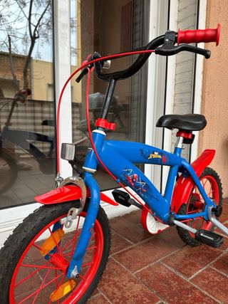 Bicicleta infantil de 16 pulgadas con temática de Marvel Spidey. - Color azul principal. - Detalles en rojo. - Ruedines incluidos.