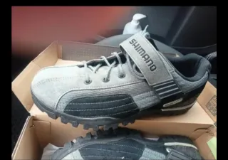 Zapatos de ciclismo Shimano, ideales para tus rutas. - Cierre de velcro y cordones. - Suela con tacos para mejor agarre. - Diseño deportivo en gris y negro.