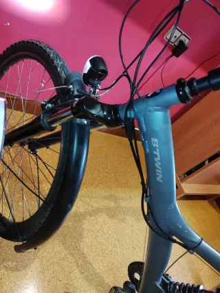 Bicicleta eléctrica Btwin en color gris. - Cuadro de aluminio. - Rueda delantera con suspensión. - Guardabarros delantero.
