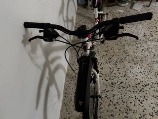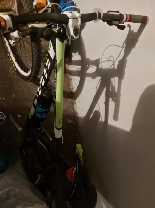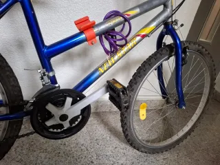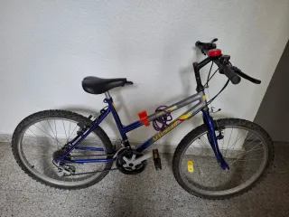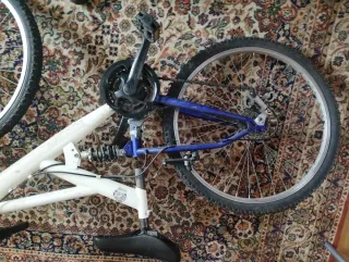 Bicicleta de montaña con ruedas de 24 pulgadas. - Cuadro blanco y azul. - Suspensión delantera y trasera. - le falta el freno de adelante pero tiene el freno de atrás y va bien. Ya le queda pequeña a mi hijo y por eso ya no le pusimos el freno de ahí si precio. Regalo casco talla S . A tratar