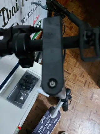 Patinete eléctrico Xiaomi en color blanco y negro. - Diseño plegable. - Ruedas negras. - Manillar negro con puños blancos. - Cargador - Rueda de repuesto