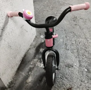 Bicicleta de equilibrio de color rosa, ideal para los más pequeños. - Marco de metal resistente. - Ruedas de goma. - Puños nuevos de goma para un mejor agarre. - Diseño con estrellas plateadas. -Regalo timbre