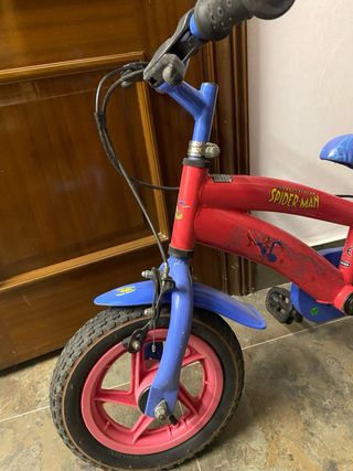 Bicicleta infantil con temática de Spiderman. Ideal para los más pequeños. - Cuadro de color rojo. - Horquilla y manillar de color azul. - Ruedines rosas. - Sillín azul con diseño de Spiderman.
