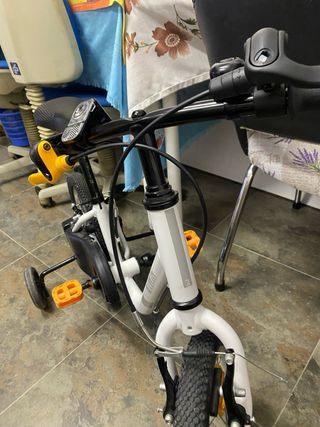 Bicicleta infantil de color blanco, ideal para los primeros paseos. Poco uso. - Ruedines incluidos para mayor estabilidad. - Pedales de color naranja. - Manillar con puños de seguridad