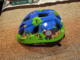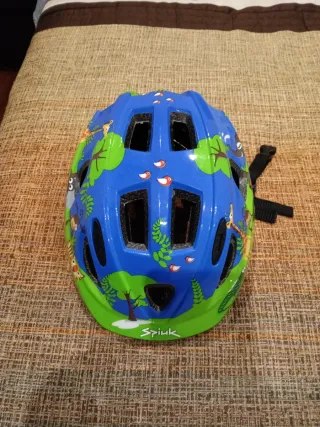 Casco de bicicleta infantil con un divertido diseño de animales y naturaleza. Nuevo ,sin usar. No negociable ,lo pongo todo barato para vender rápido.Gracias. (Regalo , reyes , navidad , chollo , barato , oportunidad , papá Noel , ganga , niño , niña , diversión ) - Diseño azul con dibujos de animales y árboles. - Color verde en la parte inferior. - Marca Spink visible en la parte frontal.