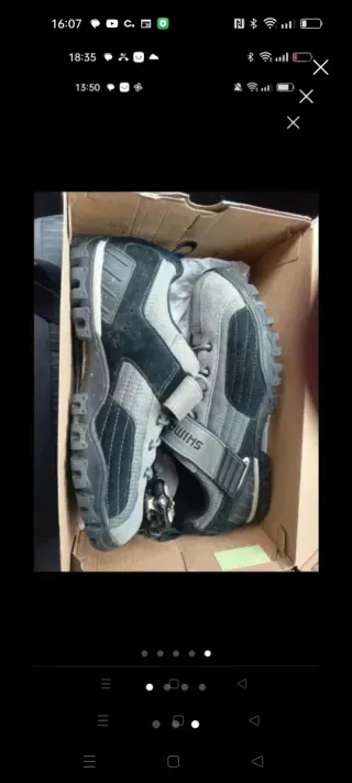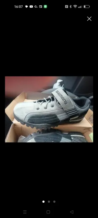 Zapatillas de ciclismo Shimano, ideales para MTB. - Cierre con velcro y cordones. - Suela con tacos para mejor agarre. - Diseño en gris y negro. Utilizadas dos puestas