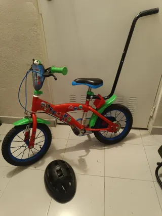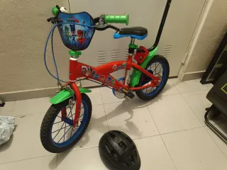 Bicicleta infantil con diseño de PJ Masks, ideal para los más pequeños. - Ruedas de 14 pulgadas. - Incluye ruedines. - Color principal rojo con detalles verdes y azules. - Incluye un manillar con bolsa decorada con los personajes. - Con barra de sujeción para aprendizaje (5€ MÁS). - Hay que ajustar frenos, pero funcionan.