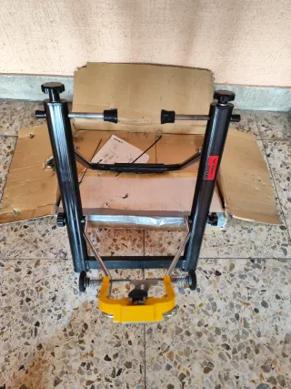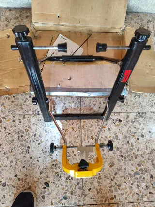 Herramienta para centrar ruedas de bicicleta. Marca Minoura. Portátil y plegable lo puedes llevar a cualquier sitio y apoyar en cualquier sitio plano. Funcionalidad y precisión. - Estructura metálica negra. - Ajustes con rosca. - Base amarilla. - Ruedas para desplazamiento. Fir, campagnolo, mavic, Sidi garmin Oakley