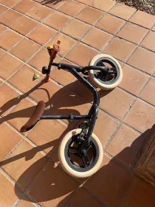 Bici de equilibrio para niños, ideal para aprender a montar. - Ruedas de goma blanca. - Asiento marrón. - Manillar con puños naranjas y amarillos.