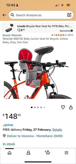 Asiento delantero para bicicleta marca Weeride. Permite llevar a un niño de forma segura y cómoda. - Montaje frontal en el manillar. - Acolchado para mayor confort.