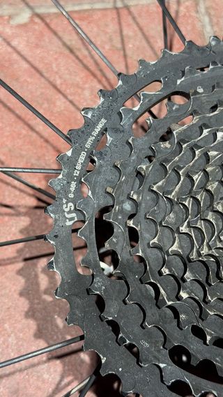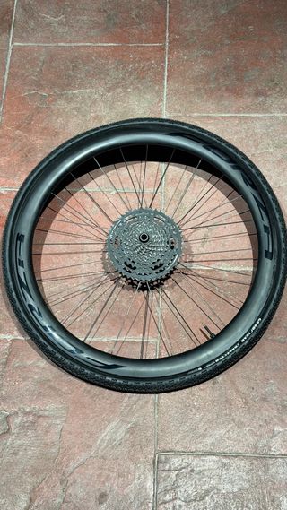 Rueda de carbono para bicicleta de gravel con neumático Goodyear nuevo, piñonera 9-46 12v y disco 160 mm - Llanta de carbono 40 mm. - Neumático Goodyear Connector. - Cassette 12v 9-46 incluido. - Disco incluido Cassete sólo 150€ Rueda con goma y disco 350€
