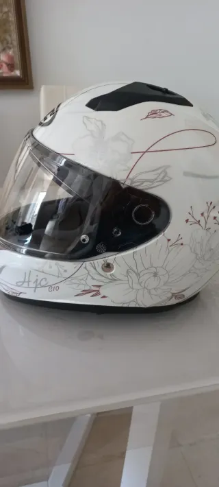 Casco integral de la marca HJC, en color blanco y con detalles gráficos. Ni se ha estrenado se ha quitado el plástico y no se puede descambiar el precio nuevo son 180 euros - Cierre de seguridad. - Visera clara. - Interior cómodo.