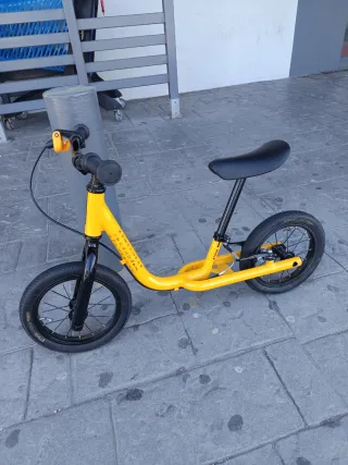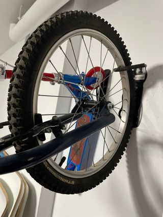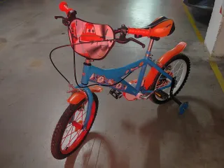 Bicicleta infantil con diseño de aviones. - Color azul con detalles naranjas. - Ruedines de apoyo incluidos. - Sillín nuevo y manillar ajustables. Usado. Excelentes condiciones.