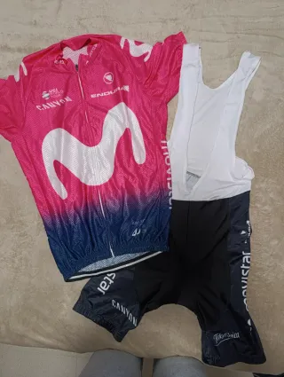 Conjunto de ciclismo del equipo Movistar. - Maillot de manga corta con cremallera. - Culotte con tirantes. - Diseño con el logo de Movistar y otros patrocinadores.