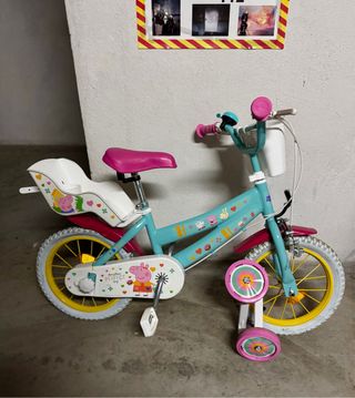 Bicicleta infantil con licencia oficial de Peppa Pig, ideal para los más pequeños (recomendada de 3 a 5 años) de 12” - Ruedines de apoyo incluidos. - Asiento y puños en color rosa. - Diseño alegre con Peppa Pig y elementos decorativos. - todos los accesorios (timbre, cestas...) ESTÁ NUEVA, usada en dos ocasiones solo