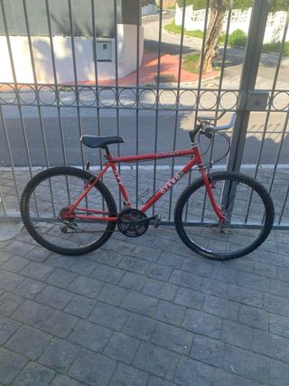Bicicleta de montaña de color rojo, ideal para paseos y rutas. - Cuadro de aluminio. - Ruedas de 26 pulgadas. - Frenos V-brake. - Cambio Shimano. La rueda trasera pierde aire Hace un par de años que no fue utilizada Hay que hacerle una revisión