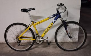 Bicicleta de montaña Merida Matts Blue Flame. - Talla 16 / 41cm. - Color azul y amarillo. Como se ve, esta bici tiene señales de uso. Habrá que reemplazar las cámaras.