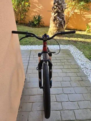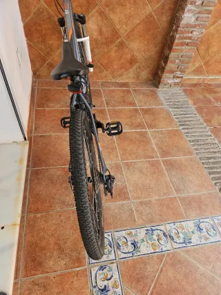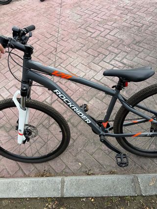 Bicicleta de montaña 27,5" aluminio monoplato Rockrider ST120 gris naranja en buen estado, lista para usar. - Cuadro de aluminio. - Frenos de disco. -Posición elevada, suspensiónde80mmy sillín ergonómico. -Unsoloplatoy8velocidades que simplificanel cambiode marchas.