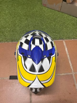 Casco de estilo enduro y motocross con un diseño llamativo. - Diseño a cuadros blanco y negro. - Detalles en azul y amarillo. - Visera integrada.