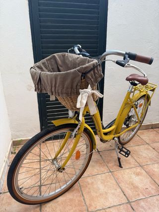 Bicicleta de paseo Kross en color amarillo, ideal para disfrutar de paseos cómodos. - Cesta delantera de mimbre. - Sillín marrón. - Portaequipajes trasero.