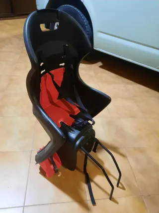 Silla para transportar a un niño o niña en la bicicleta. Es de color negro con detalles en rojo y cuenta con cinturon de seguridad. - Asiento acolchado. - Cinturon ajustable. - Hasta 22 kilos.