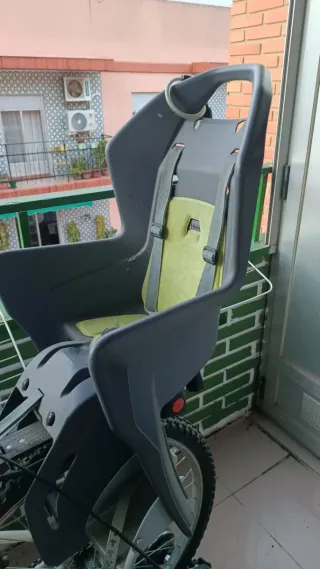 Asiento para bicicleta infantil, en buen estado y con muy poco uso. - Color gris oscuro y detalles en verde. - Incluye cinturón de seguridad.