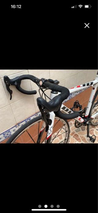 Bicicleta de carretera con manillar curvo y cinta negra. - Cuadro blanco con detalles rojos y negros. - Ruedas de radios plateados. - Pedales negros.