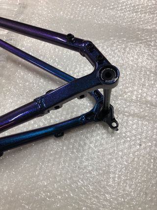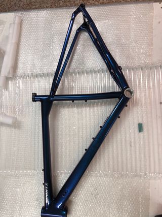 Cuadro añuminio de bicicleta con horquilla de carbono para gravel con un acabado metálico azul camaleón que cambia de tono según le incide la luz. Diseñado para ofrecer rendimiento y estilo en tus rutas. - Talla según fabricante de 160 a 173 cm - Ejes pasantes -Nuevo a estrenar, desembalado para hacer las fotografías.