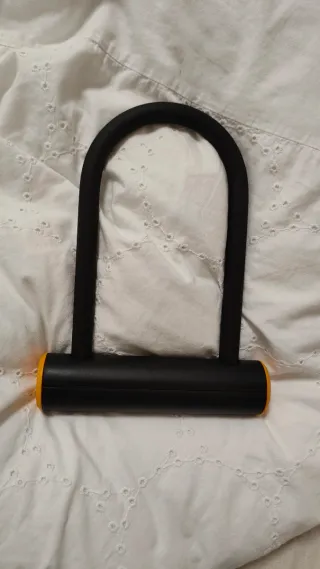 Candado en forma de U para bicicletas, patinetes, etc. Comprado en Decathlon. Es un candado muy bueno, de material muy resistente, incluso pone que es antirrobos contra herramientas cortantes, con llaves únicas, 3 llaves. El candado lo he usado 1 sola vez, para dejar la bici para ir a comprar, no lo he usado más, aún así lo dejo por ese precio porque se me cayó al suelo y tiene un ligero rasguño. Por lo demás es muy robusto, pesa mucho, se siente muy buena calidad y tiene las endiduras para la llave escondidas, eso es un puntazo. Demás información en las fotos, junto con la factura del día de compra y precio. NO NEGOCIABLE.