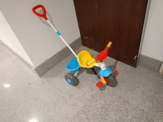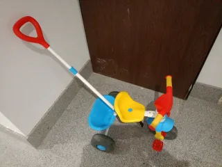 Triciclo infantil de colores vivos, ideal para los más pequeños. Cuenta con un práctico empujador para que los adultos puedan guiarlo. - Asiento amarillo. - Ruedas de plástico. - Empujador rojo y blanco.