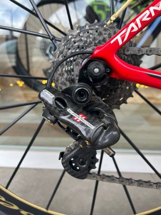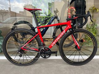 Bicicleta de carretera Specialized Tarmac en talla 52. Cuadro de carbono con componentes de alta gama. - Color rojo y negro. - Ruedas Lightweight, tubular - Campanoglo eps, frenos trp doble pivote, potenciometro Quarq, bielas de carbono. -6’8 tal cual en la foto