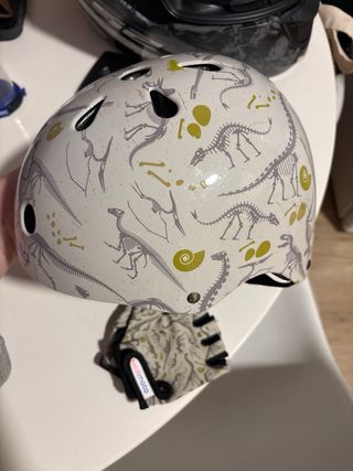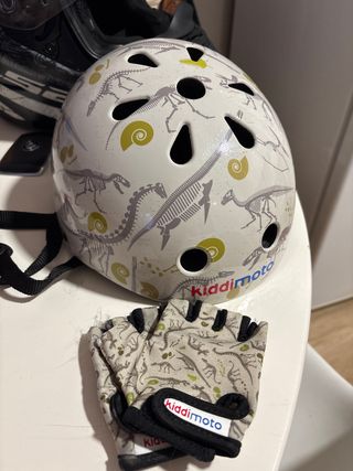Conjunto de casco y guantes de la marca Kiddimoto, con un divertido diseño de dinosaurios y fósiles. - Casco con estampado de dinosaurios y fósiles. - Guantes a juego con estampado de dinosaurios. - Marca: Kiddimoto.