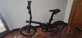 Bicicleta plegable Btwin en color negro. Perfecta para desplazamientos urbanos y fácil de guardar. - Cuadro plegable. - Ruedas de tamaño compacto. - Sillín ajustable.