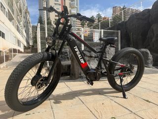 Bicicleta eléctrica Tifgalop con ruedas anchas tipo fat bike. Ideal para todo tipo de terrenos. - DOBLE MOTOR - Color negro con detalles rojos. - Cuadro robusto. - Suspensión delantera y trasera. - Portaequipajes trasero.