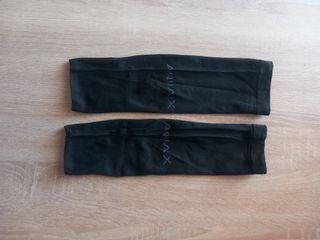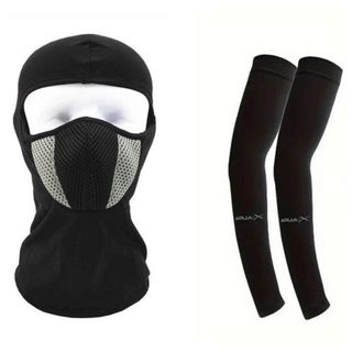 Conjunto de máscara facial y mangas protectoras para actividades al aire libre. - Máscara negra con panel de malla transpirable. - Mangas protectoras de color negro con logo. - Set de dos mangas.