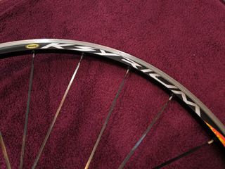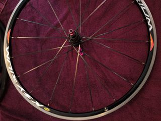 Rueda trasera de bicicleta marca Mavic Ksyrium, tamaño 28 pulgadas. - Llanta de aluminio. - Radios negros. - Buje negro con detalles rojos y rosas. Puedo enviarla por Inpost