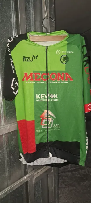 Maillot de ciclismo con diseño llamativo y detalles de patrocinadores. - Logo de Gijsemberg en la parte superior. - Diseño KEVOK MAATKASTEN - DEUREN. - Estampado de casa con detalles rojos y plateados. - Bolsillos traseros. - Logo KREATIV. - Marca NSVU Clothing.