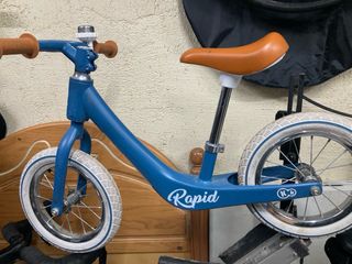 Bicicleta de equilibrio para niños, modelo Rapid. Ideal para iniciarse en el mundo de las dos ruedas. - Color azul. - Asiento marrón. - Ruedas blancas.