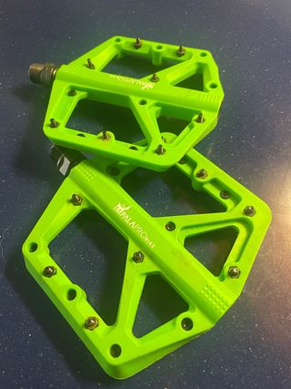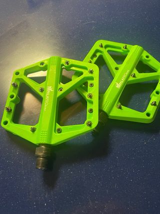 Par de pedales planos para bicicleta de montaña. - Color verde brillante. - Marca IMPALAPROBIKE. - Diseño con pines para mayor agarre. - Cuerpo de aluminio.